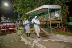 Os profissionais de limpeza da Prefeitura Municipal fizeram a desinfecção com a ajuda de um Caminhão Jato Forte, utilizando uma solução preparada a base de hipoclorito de sódio, como recomendado pela Agência Nacional de Vigilância Sanitária (Anvisa).