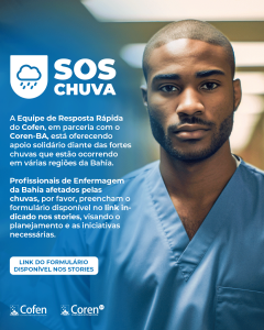 Diante das fortes chuvas que castigaram diversas regiões da Bahia, o Conselho Federal de Enfermagem (Cofen), em parceria com o Conselho Regional de Enfermagem da Bahia (Coren-BA), lançam uma iniciativa solidária e voluntária para auxiliar os profissionais de Enfermagem que foram diretamente impactados por essa tragédia.