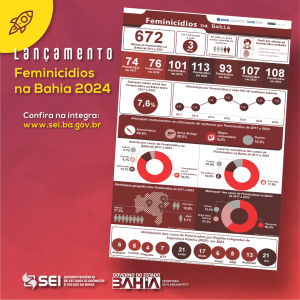 A Superintendência de Estudos Econômicos e Sociais da Bahia (SEI), em parceria com a Secretaria da Segurança Pública da Bahia (SSP-BA), apresenta à sociedade a atualização do infográfico Feminicídios na Bahia. O trabalho é mais um produto da parceria entre a SEI e a SSP-BA e traz a caracterização e o perfil das vítimas de feminicídios no estado. Os dados utilizados são derivados dos Boletins de Ocorrência (BO), registrados pela Polícia Civil (PC), entre os anos de 2017 e 2023.