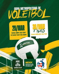 Simões Filho recebe, nos dias 29 e 30 de março, a Copa Metropolitana de Voleibol, torneio que marca a abertura do calendário estadual de competições da modalidade. A competição é organizada pela Federação Baiana de Voleibol, com o apoio da Prefeitura de Simões Filho, por meio da Secretaria de Esporte, Lazer e Juventude (Sejuv), e serve como preparação para o Campeonato Baiano da categoria Open, que terá início em abril.