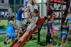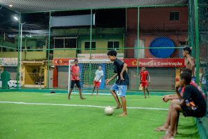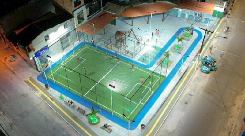 Outro destaque é a quadra com grama sintética, que garante mais conforto e funcionalidade para a prática esportiva, incentivando atividades físicas entre jovens e adultos.