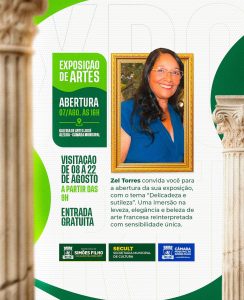 A cidade de Simões Filho será palco de uma nova e sensível imersão artística. A artista Zel Torres apresenta, a partir do dia 07 de agosto, a exposição “Delicadeza e Sutileza”, na Galeria de Artes José Aleluia, localizada na Câmara de Vereadores – Praça da Bíblia. A abertura oficial acontece às 16h e contará com a presença da artista.