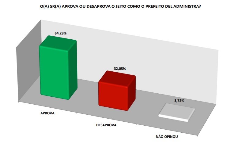 Divulgado nesta segunda-feira (6), o levantamento também fez uma avaliação do governo de Del, tomando opiniões do ótimo ao péssimo. Os que acham ótimo foram 12,05% e os que classificam como bom, 39,10%.