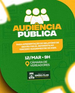 A Prefeitura de Simões Filho, por meio da Secretaria da Fazenda (Sefaz), realiza nesta quinta-feira (12), às 9h, uma audiência pública para apresentação do Relatório de Gestão Fiscal referente ao 3º quadrimestre de 2025. A atividade acontecerá na Câmara Municipal de Vereadores, localizada no Centro da cidade.